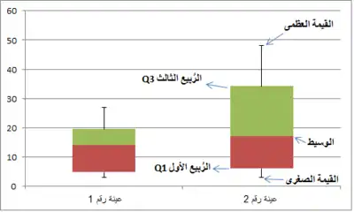 مخطط صندوقي لعنتين احصائيتين يظهر عليه دلالات الربيعات بشكل بياني