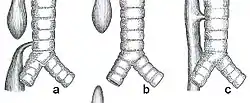 ![]() الأنواع الشائعة لرتق المريء a) رتق المريء البعيد مع ناسور رغامي مريئي (86٪)، Gross C. b) رتق المريء المعزول بدون ناسور رغامي مريئي (4٪)، Gross A. c) ناسور رغامي مريئي على شكل حرف H (7٪)، Gross E.[1] الأنواع الشائعة لرتق المريء a) رتق المريء البعيد مع ناسور رغامي مريئي (86٪)، Gross C. b) رتق المريء المعزول بدون ناسور رغامي مريئي (4٪)، Gross A. c) ناسور رغامي مريئي على شكل حرف H (7٪)، Gross E.[1] | |