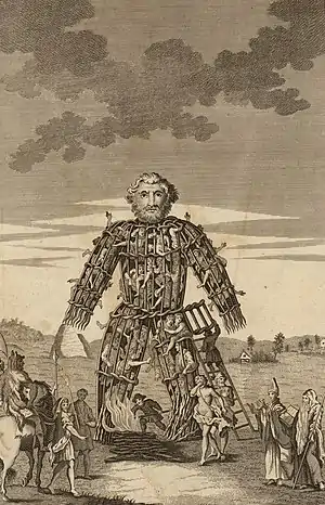 وذكر أحد التعليقات في العصور الوسطى، أن الرجال كانوا يُحرَقوا في مانيكان خشبي من أجل التضحية إلى تارانيس (إله الرعد عند الكلت).[9]