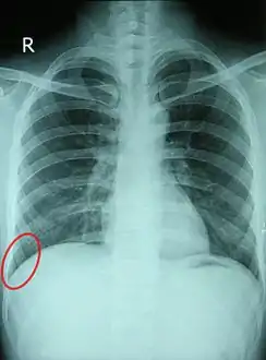 ![]() أشعة سينية صدرية لرجل سليم في الثلاثين من عمره، وتظهر الردبة مُشاراً إليها بالأحمر. | |