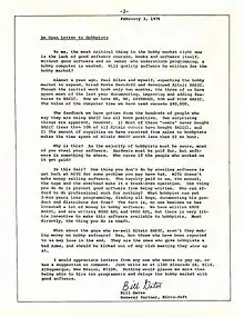 عبر بيل غيتس عن خيبة أمله مما يفعله معظم الهواة بنسخ برنامج ألتير بيسيك بدون دفع ثمنه، وقال إن مثل هذه الممارسة لا تشجع المطورين على استثمار المال والوقت في كتابة برمجيات جيدة، وأشار إلى "الظلم" الواقع تجاه مطوري البرمجيات الذين لا يُدفع لهم مقابل استخدام البرمجيات.