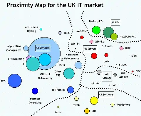 على سبيل المثال، هذه خريطة تقارب لسوق تكنولوجيا المعلومات في المملكة المتحدة تستند إلى قيم عام 2004: