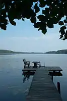 رصيف فنلندي نموذجي به طاولة وكرسي وسلم للسباحين في جوتسا، وسط فنلندا