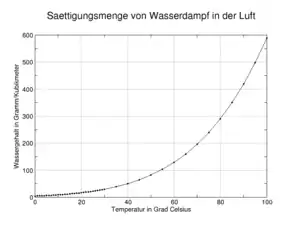 يتزايد تركيز التشبع لبخار الماء بتزايد درجة الحرارة وتتبع العلاقة بينهما دالة أسية كما هو موضح في منحنى التشبع في الشكل. وتكون لكل درجة حرارة تركيز معين محدد لتشبع بخار الماء في الهواء. عند الضغط العادي الذي يبلغ 1013,25 باسكال ودرجة حرارة 10 درجة مئوية يمكن للهواء احتواء 9,40 جرام من الماء. ونفس كمية الهواء يمكنها أن تحوي 30,4 جرام ماء عند 30 درجة مئوية، وعند 60 درجة مئوية يمكنها احتواء 100 جرام من الماء.