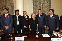 رؤساء دول أمريكا الجنوبية يلتقون في ريو دي جانيرو. من اليسار إلى اليمين: رفائيل كوريا (الإكوادور)، إيفو مورالس (بوليفيا)، لويس إيناسيو لولا دا سيلفا (البرازيل)، ميشال باشيلي (الشيلي)، هوغو تشافيز (فينيزويلا) ونيكادور دوارتي (الباراغواي)