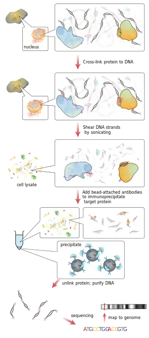 مواقع الحمض النووي المحددة في التفاعل الجسدية المباشر مع عوامل النسخ والبروتينات الأخرى يمكن عزلها عن طريق الترسيب المناعي الكروماتين . تنتج ChIP مكتبة مواقع الحمض النووي المستهدفة المرتبطة ببروتين مهم في الجسم الحي . تُستخدم تحليلات التسلسل المتوازي بشكل كبير بالاقتران مع قواعد بيانات تسلسل الجينوم الكامل لتحليل نمط تفاعل أي بروتين مع الحمض النووي، [1] أو نمط أي تعديلات كروماتينية جينية. يمكن تطبيق ذلك على مجموعة البروتينات والتعديلات القادرة للحصول على chip ، مثل عوامل النسخ والبوليمرات والآلات النسخية والبروتينات الهيكلية وتعديلات البروتين وتعديلات الحمض النووي . [2] وكبديل للاعتماد على أجسام مضادة محددة، وتم تطوير طرق مختلفة للعثور على مجموعة شاملة لجميع المناطق التنظيمية النشطة في جسيم نووي المستنفدة للنيوكليوم أو النيوكليوسوم في الجينوم مثل DNase و FAIRE seq .