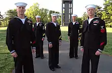 خمسة من ضباط البحرية التابعين للولايات المتحدة يرتدون الزي العسكري.