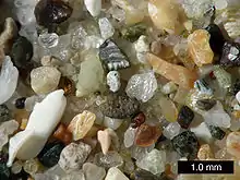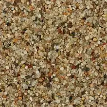 أما الرمل المنقول لمسافات طويلة بفعل المياه أو الرياح فتكون حبيباته مستديرة، وعادة ما تكون رمال الصحراء من هذا النوع.[8]