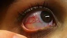 - يتطور لدى معظم الناس توسع في الشعيرات (الأوعية الدموية البارزة) على الغطاء الذي يغطي الجزء الأبيض (الصلبة) من العين.