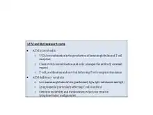 أثناء تطور الخلايا الليمفاوية من الخلايا الجذعية في نخاع العظم إلى خلايا ليمفاوية ناضجة في المحيط، فإنها تقوم بإعادة ترتيب قطع معينة من حمضها النووي (عملية إعادة التركيب). هذه العملية تتطلب من هذه الخلايا تكسير أشرطة حمضها النووي، لكن سيصعب اصلاح هذه الأشرطة بغياب ATM.[34][35][36][37] كنتيجة لهذا، فإن معظم الأفراد المصابين بمتلازمة الترنح وتوسع الشعيرات لديهم نقص في أعداد الخلايا الليمفاوية ووظائفها (مثل خلل في القدرة على إنتاج أجسام مضادة كردة فعل للمطاعيم الوقائية والعدوى). بالإضافة لهذا، فإن قطع الحمض النووي في الكروموسومات المشاركة في عملية إعادة تركيب الحمض النووي لديها المَيْل لتتحد مع جينات أخرى (الانتقال)، مما يعرّض الخلايا إلى تطوير السرطان (لوكيميا، ليمفوما).