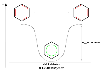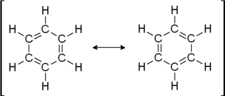 طبقا لقاعدة الغاز النبيل تكون الجزيئات المستقرة التي تحيط كل ذرة فيها 8 إلكترونات تكافؤ . وفي حالة البنزول فيمكن صياغته في صيغتين تعبرين عن توزيع الرابطات الأحادية والثنائية فيه ؛ يحدث بينها رنين.