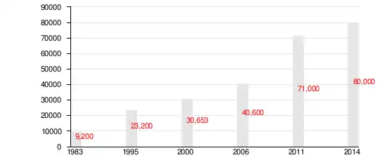 | التعداد السكاني | 9,200 | 22,456 | 30,653 | 40,000 | 71,000 | 80,000 |