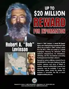|CitationClass=تم تجاهله (مساعدة) - "FBI — Eight Year Anniversary of the Disappearance of Robert A. Levinson". FBI. مؤرشف من الأصل في 31 مارس 2020. الوسيط