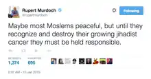 - "Murdoch says Muslims must be held responsible for France terror attacks". الغارديان. 10 January 2015. مؤرشف من الأصل في 02 أغسطس 2018. اطلع عليه بتاريخ 10 يوليو 2015. الوسيط