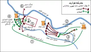وفي أكتوبر 1094م، حاول المرابطون مهاجمة بلنسية، لكنهم انهزموا أمام قوات رودريغو دياث في معركة كوارت.[68] وجد رودريغو دياث أنه أمام هجمات المرابطين المتكررة، لا بد له من تأمين حدوده الشمالية، فتحالف مع بيدرو الأول ملك أراغون الذي خلف أباه سانشو راميريث الذي توفي فجأة أثناء حصاره لوشقة سنة 1094م. وفي سنة 1097م، شنّ المرابطين حملة جديدة، والتقوا مع جيش رودريغو دياث وحليفه الجديد بيدرو الأول في أحواز بلنسية عند جبل مندير، وانتهت مواجهتهم بهزيمة جديدة للمرابطين في معركة بريانة.[ْ 14]