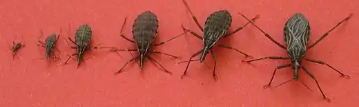 الحشرة لديها خمس مراحل اليرقات ، مع التشبع بين كل منهما. وتستهلك كل مرحلة من مراحل اليرقات وجبة دم كبيرة واحدة ، مما يؤدي إلى بدء عملية التقشير ، بعد 12 إلى 15 يومًا. أظهر ويغلسوورث أن عملية التشبع تبدأ من هرمون يفرز في الدم بواسطة غدة في الدماغ. علاوة على ذلك ، تم إثبات أن الكالفا الاتا يفرز هرمون حدث الشباب الذي يمنع التطور سابق لأوانه إلى بالغ. ويؤدي إزالة الرأس خلال أي مرحلة من مراحل اليرقات إلى تطور مبكر إلى شخص بالغ ، في حين أن زرع رأس الأحداث خلال المرحلة اليرقية الخامسة يؤدي إلى يرقة عملاقة سادسة المرحلة.[3]