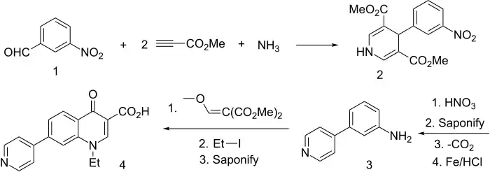 تخليق روزوكساسين يبدأ اصطناع هانتش للبيريدين المعدل تستخدم أجزاء المكونات المعروفة باسم خلات الأمونيوم، وهما مكافئات من الميثيل بروبيولات، و1 من 3- نتروبنزالديهايد. تتم أكسدة ديهيدروبيريدين الناتج (2) مع حامض النيتريك يليه التصبين، نزع الكربوكسيل، واختزال مجموعة النيترو بالحديد وحمض الهيدروكلوريك يعطي الأنيلين 3. هذا يخضع لتتابع تقليدي من تفاعل غولد-جاكوبس مع methoxymethylenemalonate استر لتشكيل حلقة 4-hydroxyquinoline، ثم الألكلة مع أثيل يوديد والتصبين الإستري لاستكمال تصنيع العامل المضاد للجراثيم روزوكساسين (4).