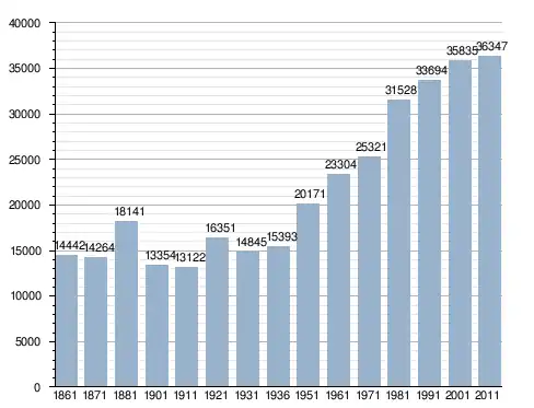 في سنة 1861 بلغ عدد السكان 14٬442 نسمة، وتطور العدد ليصل في سنة 2011 لـ 36٬347 نسمة.