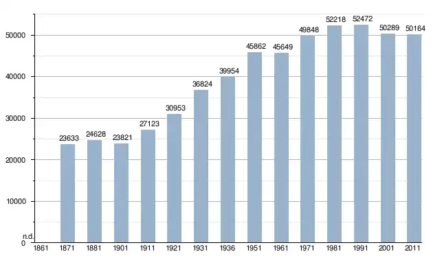 في سنة 1871 بلغ عدد السكان 23٬633 نسمة، وتطور العدد ليصل في سنة 2011 لـ 50٬164 نسمة.