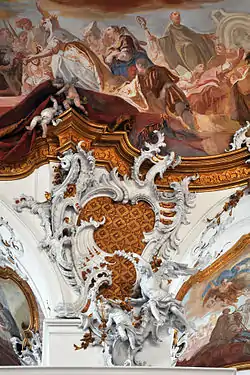 بلغ أسلوب روكوكو الزخرفي قمة ازدهاره في جنوب ألمانيا ووسط أوروبا منذ ثلاثينيات القرن الثامن عشر وحتى سبعينياته. قُدم لأول مرة في فرنسا من خلال منشورات وأعمال المهندسين المعماريين والمصممين الفرنسيين، بمن فيهم النحات كلود الثالث أودران، والمصمم الداخلي جيل- ماري أوبنوردت، والمهندس المعماري جيرمان بوفران، والنحات جان موندون، والرسام والنقاش بيير ليبوتر. امتلك عملهم تأثيرًا مهمًا على أسلوب الروكوكو الألماني.[13]