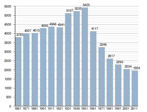 في سنة 1861 بلغ عدد السكان 3٬783 نسمة، وتطور العدد ليصل في سنة 2011 لـ 1٬954 نسمة.