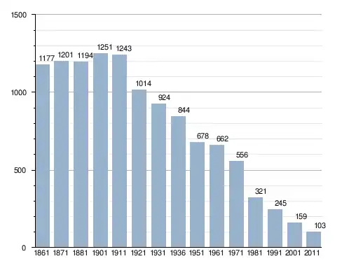 في سنة 1861 بلغ عدد السكان 1٬177 نسمة، وتطور العدد ليصل في سنة 2011 لـ 103 نسمة.