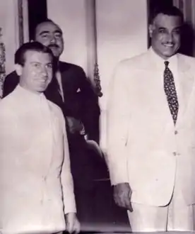 ![]() استقبل الرئيس جمال عبد الناصر الملحن والموسيقار رياض البندك عام 1954 في مساهمته لتأسيس إذاعة صوت العرب | |