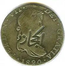 عملة إسبانية تحمل صورة ملك إسبانيا الملك فرناندو السابع وقد نقش عليها اسم الحجاز وكانت تستخدم في الحجاز سنة 1820 م