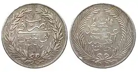 جميع القطع سكت في باردو. أول ورقة نقدية تونسية أصدرت عام 1847 وكانت من فئة 50 ريالاً.