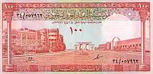 100 | 176 × 86 | أحمر | يتوسط الورقة صورة تمثل بوابة قصر الناصرية، في اليسار صورة تمثل مجلس الوزراء، يمين الورقة صورة تمثل المعهد الملكي الفني |