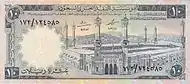 أزرق | يتوسط الورقة صورة تمثل الكعبة المشرفة، يليها من اليمين صورة تمثل الملك عبد العزيز | صورة تمثل الحرم | صورة الملك عبد العزيز