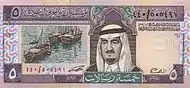 5 | 145 × 66 | زهري | يتوسط الورقة صورة تمثل الملك فهد بن عبد العزيز، يلي الصورة من اليسار صورة تمثل مراكب تسيل في الخليج. |
