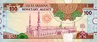 100 | 182 × 86 | أزرق | يتوسط الورقة صورة تمثل الحرم المكي الشريف، يمين الورقة صورة تمثل الملك عبد العزيز. |