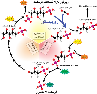يقوم إنزيم روبيسكو RuBisCO بتحفيز التفاعل بين RuBP وثنائي أكسيد الكربون، ويكون الناتج عبارة عن مركب وسطي ذي ست ذرات كربون وهو غير مستقر يعرف باسم 3-كيتو-2-كربوكسي أرابينيتول 5,1-مضاعف فوسفات. يتفكك هذا المركب الوسطي غير المستقر إلى جزيئين من 3-فوسفوغليسيرات (3-PGA).