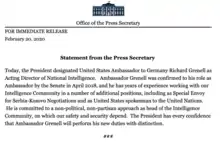 |CitationClass=تم تجاهله (مساعدة) - Barnes, Julian E.; Haberman, Maggie (February 19, 2020). "Trump Names Richard Grenell as Acting Head of Intelligence". NYTimes.com. مؤرشف من الأصل في 25 مايو 2020. الوسيط