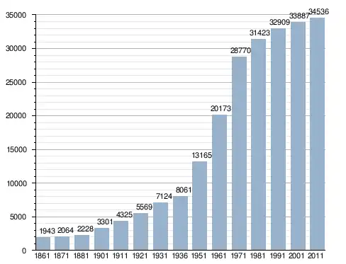 في سنة 1861 بلغ عدد السكان 1٬943 نسمة، وتطور العدد ليصل في سنة 2011 لـ 34٬536 نسمة.