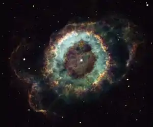 - رياح النجوم الساخنة: عند درجة حرارة 10.000 كلفن أو أكثر لسطح النجم وتكون لها نفس التركيب الكيميائي للسطح نفسه. وتكون معظم الذرات متأينة أحاديا أو أكثر (أي فاقدة إلكترون أو أكثر). ويمكن أن تصل سرعات تلك الرياح النجمية عدة آلاف كيلومتر في الثانية. وتنشأ رياح النجوم الساخنة تحت ضغط الإشعاع الصادر من النجم ويحدث فيه امتصاص لبعض خطوط الطيف في نطاق الأشعة فوق البنفسجية.[3] ويبلغ فقد المادة من النجم بين لنجوم النسق الأساسي إلى للعمالقة العظام وإلى في نجم وولف-رايت. وقد حدث نشاط زائد في نجم إيتا كارينا في عام 1840 واستمر لمدة عامين فقد خلالها نحو نصف كتلة شمسية في العام. رياح النجوم الساخنة لا تكون متجانسة. ويمكن مشاهدة عدم تجانس الرياح في النجوم الثنائية المصدرة لاشعة إكس بطريقة غير مباشرة. حيث تنجذب الريح النجمية إلى قزم أبيض شديد الكثافة أو من نجم نيوتروني أو من ثقب أسود وتبدأ في الالتفاف حوله في هيئة قرص. وعند اصطدام الريح بالقزم الأبيض أو بالنجم النيوتروني تنشأ أشعة سينية في هيئة أشعاع حراري تتناسب مع كمية الريح في القرص. وهذا يسمح بدراسة وتحليل التكوين الغير منتظم للرياح النجمية الصادرة من نجوم ساخنة. D.[4]