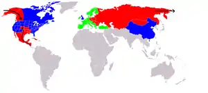 Blue: The الولايات المتحدة and its allies كندا، the المملكة المتحدة and the الصين.