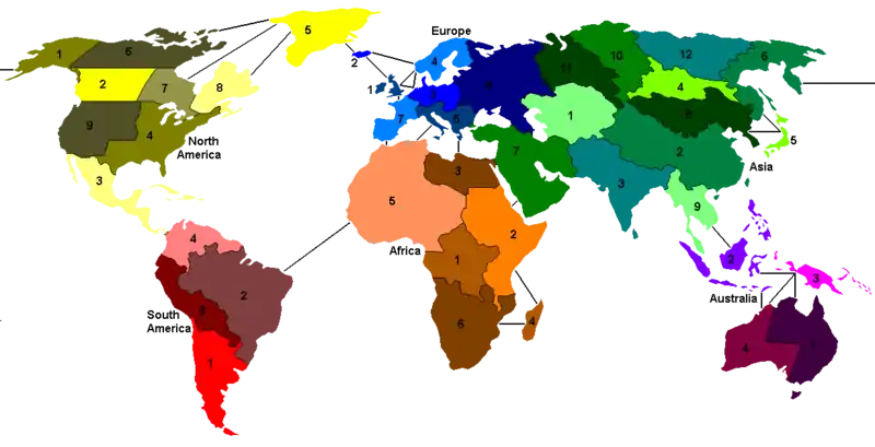 تمثل الأرقام بين الأقواس عدد القوات الإضافية التي تمنح للاعب الذي يحتل جميع أقاليم تلك القارة. تستعمل بعض الإصدارات تسميات مختلفة لبعض الأقاليم، كتبت هذه التسميات بين أقواس.