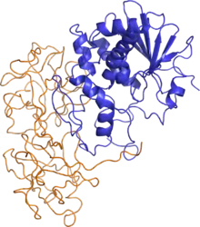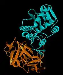 | Ricin structure. The A chain is shown in blue and the B chain in orange. | |