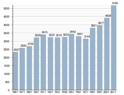 في سنة 1861 بلغ عدد السكان 2٬327 نسمة، وتطور العدد ليصل في سنة 2011 لـ 5٬186 نسمة.