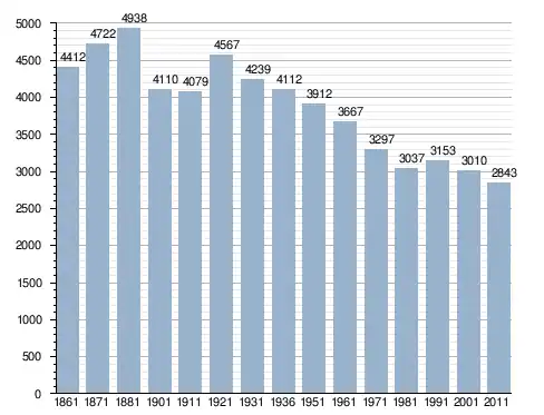 في سنة 1861 بلغ عدد السكان 4٬412 نسمة، وتطور العدد ليصل في سنة 2011 لـ 2٬843 نسمة.
