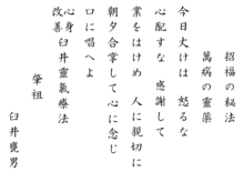 ![]() مفاهيم ميكاو أوسوي الخمسة كما وردت في النص كاملا (قراءة الكتابة اليابانية من أعلى إلى أسفل، والانتقال من اليمين إلى اليسار). ملاحظة: تبدأ المفاهيم أو المبادئ الخمس من العمود الثالث من اليمين بعد الفراغ، ثم تستمر في الأعمدة والرابع والخامس يمينا. |