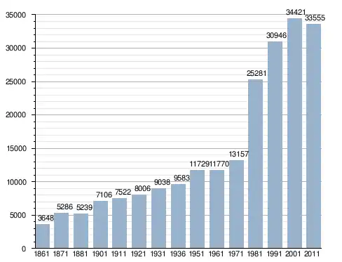 في سنة 1861 بلغ عدد السكان 3٬648 نسمة، وتطور العدد ليصل في سنة 2011 لـ 33٬555 نسمة.