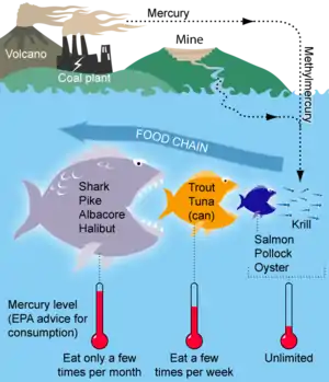 يُعتبر استهلاك الأسماك إلى حد بعيد أهم مصدر للتعرض للزئبق لدى البشر والحيوانات.[3] ويوجد الزئبق وميثيل الزئبق بتركيزات صغيرة جدًا في مياه البحر. ومع ذلك يتم امتصاصه، عادة كميثيل الزئبق، بواسطة الطحالب في بداية السلسلة الغذائية. ثم تؤكل هذه الطحالب من قبل الأسماك وغيرها من الكائنات الحية الموجودة في المستويات الأعلى من السلسلة الغذائية. وتمتص الأسماك بكفاءة ميثيل الزئبق، ولكنها تفرزه ببطء شديد.[4] يشار إلى أن ميثيل الزئبق ليس قابلاً للذوبان، وبالتالي يتعذر إفرازه. وإنما يتراكم، وبشكل أساسي في الأحشاء، على الرغم من أنه يتراكم أيضًا في الأنسجة العضلية.[5] وهذا يؤدي إلى التراكم الأحيائي للزئبق، في أي من الأجزاء النامية في الأنسجة الدهنية ذات المستويات الغذائية المتتالية مثل: العوالق الحيوانية والسوابح الصغيرة والأسماك الأكبر حجمًا وما إلى ذلك. وكلما كانت هذه الأسماك أكبر حجمًا، زاد امتصاصها للزئبق. وأي شيء يأكل هذه الأسماك ضمن السلسلة الغذائية ان اكل التونة بشكل كبير والتي تملك 0.001 من الزئبق وهو بحد ذاته يسبب صداع وأرق و ضعف في الرؤية وفقدان الداكرة، فإنه يستهلك أيضًا المستوى الأعلى من الزئبق المتراكم فيها. وتفسر هذه العملية السبب وراء كون الأسماك المفترسة مثل سياف البحر أو القرش أو طيور مثل العقاب والنسور تتمتع بتركيزات من الزئبق في أنسجتها أعلى من نسب الزئبق التي تتعرض لها الأسماك مباشرة. ومؤخرًا، كان للتركيز العالي للزئبق في المأكولات البحرية علاقة بالوفاة الجماعية لثعالب القطب الشمالي.[6] ويمكن للأنواع الموجودة بالسلسلة الغذائية تجميع تركيزات الزئبق إلى ما يصل إلى عشرة أضعاف مقارنة بالأنواع التي تستهلك الزئبق. وتُسمى هذه العملية التضخم الأحيائي. على سبيل المثال، تحتوي الرنجة على مستويات زئبق تبلغ حوالي 0.01 جزء من المليون، في حين يحتوي القرش على مستويات زئبق أكثر من 1 جزء من المليون.[7]
