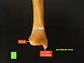 الزائدة الإبرية للزند تظهر ناتئة في نهاية العظم السفلية. عرض إنسي.