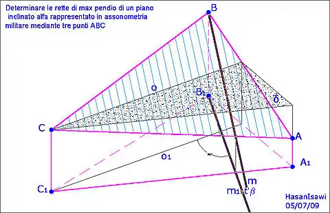 يُعرف أن خطوط أقصى انحدار لمستوى ألفا يجب أن تكون عمودية على الخطوط الأفقية التي تنتمي لنفس المستوى ألفا. لإيجاد خط افقي o, يُقطع ألفا بمستوى أفقي دلتا. حالما نجد o, وبما ان الصورة الاكسونومترية للزاوية بين خط أقصى انحدار m والخط الأفقي o ليست حقيقية، يُشرع بإسقاط o على المستوى الأفقي بي لإيجاد المسقط الأول o1 للخط الأفقي o. ثم يرسم الإسقاط الأول m1 (لخط أقصى انحدار m) بطريقة متعامدة على o1. بعد أن نجد m1, نسقطه على ألفا باستخدام مستوى رأسي بيتا. وبهذا يحدد خط أقصى انحدار m للمستوى ألفا كخط تقاطع بين المستويين الفا وبيتا. الخطوط الأخرى الأقصى انحدار للمستوى ألفا ستكون موازية للخط m. لتحديد المسافة بين هذة الخطوط، نُعين, انطلاقاً من النقطة C، نقط تبعد عن بعضها بمسافة تساوي المقياس المعطى x, ومن هذه النقط ترسم تلك الخطوط بحيث تكون موازية للخط m. وهذا ما هو مطلوب.