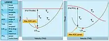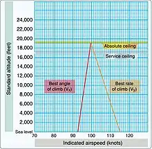سرعة نوع الطائرة التي تكون فيها زاوية الصعود أكبر تسمى VX. إنها دائمًا أبطأ من VY، السرعة لأفضل معدل صعود. نظرًا لأن هذا الأخير يوفر أسرع طريقة للحصول على مستويات الارتفاع، بغض النظر عن المسافة المقطوعة أثناء هذه المناورة، فهو أكثر صلة بالقيادة. من ناحية أخرى، فإن الحد الأقصى لزاوية الصعود هو المكان الذي تكتسب فيه الطائرة أكبر ارتفاع في مسافة معينة ، بغض النظر عن الوقت اللازم للمناورة. هذا مهم لإزالة العوائق، وبالتالي هو السرعة التي يستخدمها الطيار عند تنفيذ إقلاع "مجال قصير". يزيد VX مع الارتفاع ويقل VY مع الارتفاع حتى يتقاربان عند السقف المطلق للطائرة. [2]