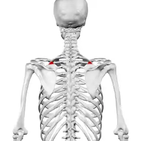 ![]() عظام ظهر الإنسان. الزاوية العلوية للكتف موضحة باللون الأحمر. عظام ظهر الإنسان. الزاوية العلوية للكتف موضحة باللون الأحمر. | |