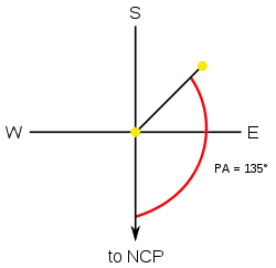 في حالة النجوم الثنائية المرئية المرصودة، يتم تعريفها على أنها زاوية الانجراف للنجم الثانوي عن الرئيسي، وتقاس عكس اتجاه عقارب الساعة، نسبة إلى القطب السماوي الشمالي. وتطبق على المجرة، وتقيس ميل الجرم الفلكي، وفي هذة الحالة هي الزاوية بين محور المجرة الطويل وخط من مركزها يتجة شمالا.[2]
